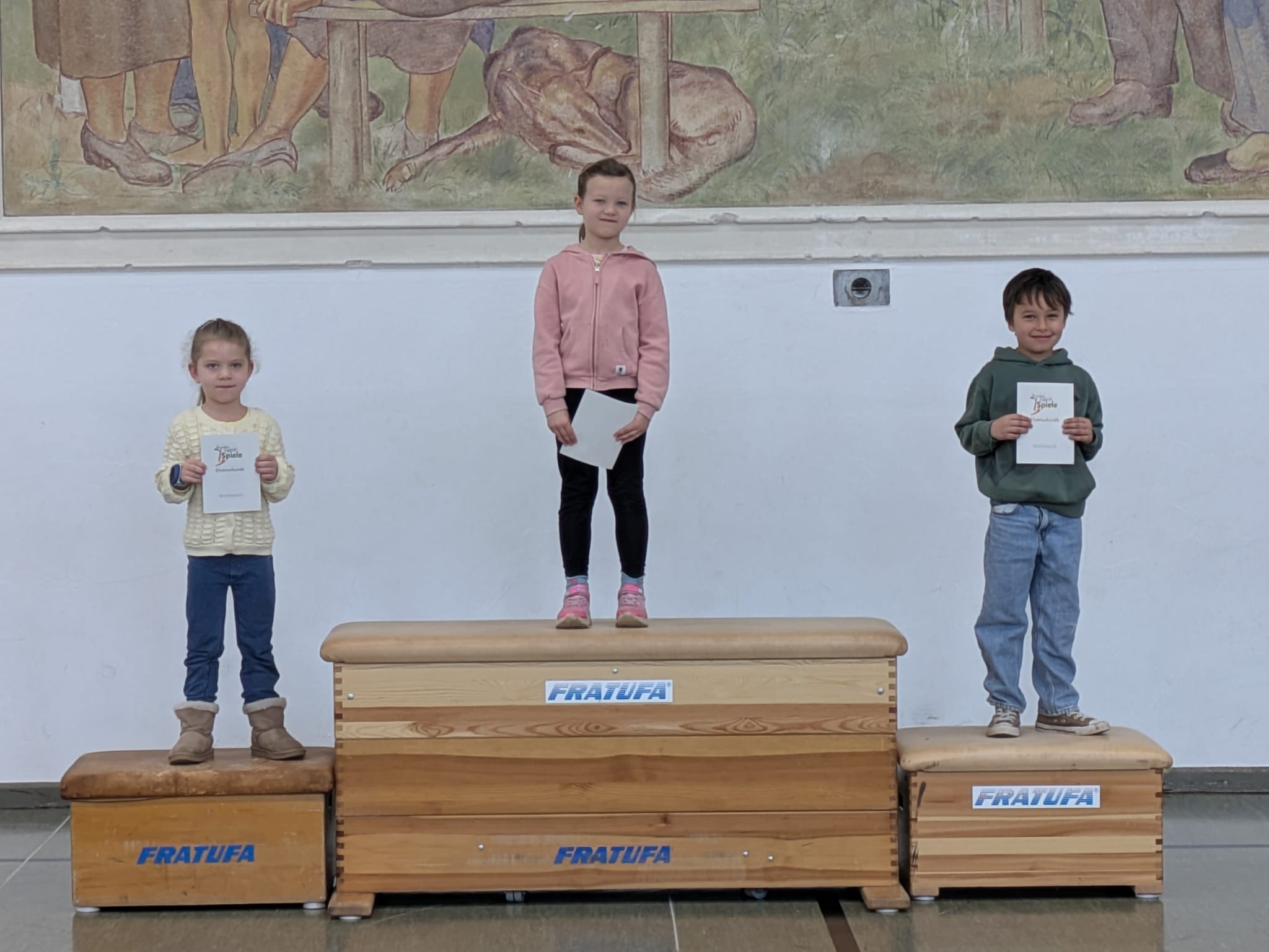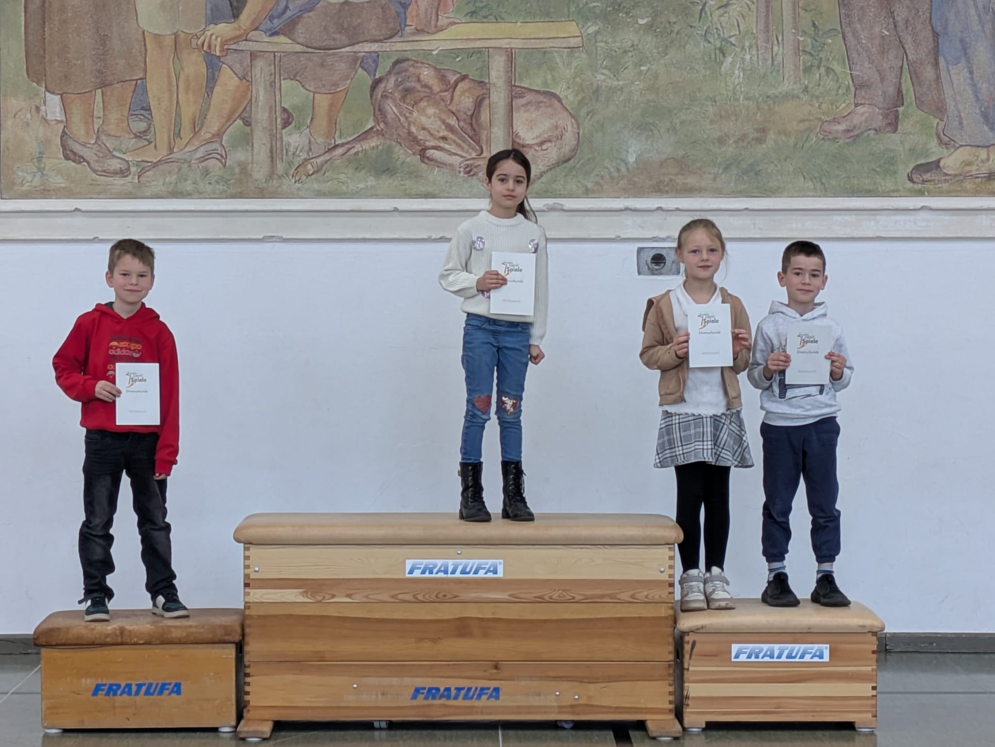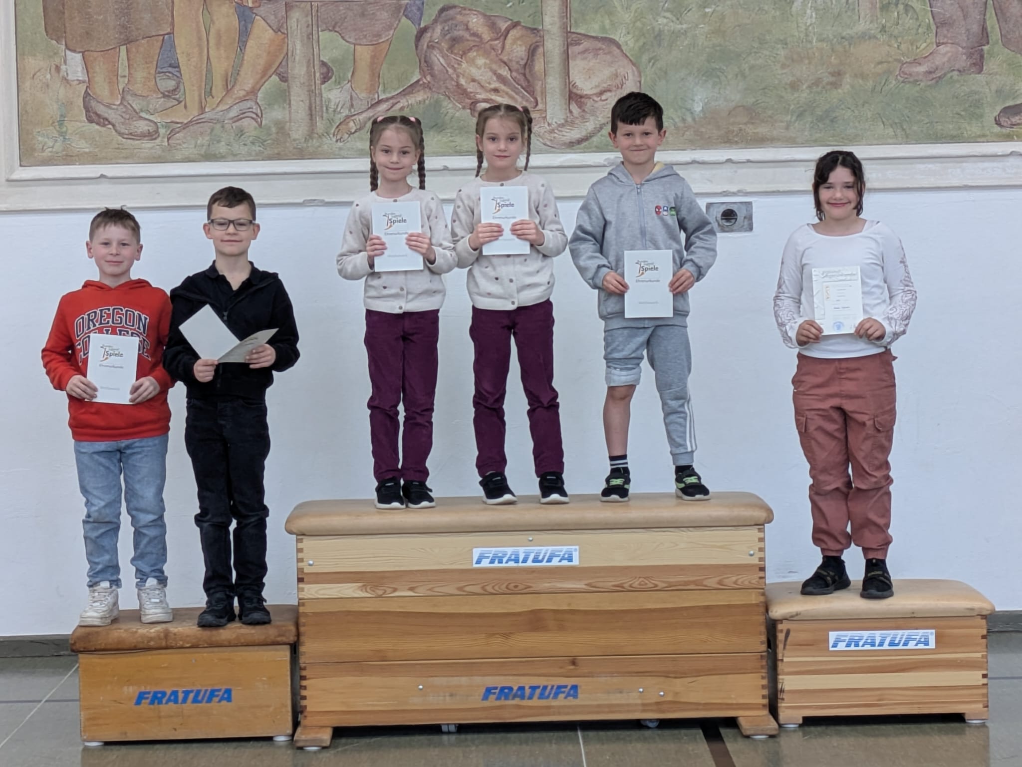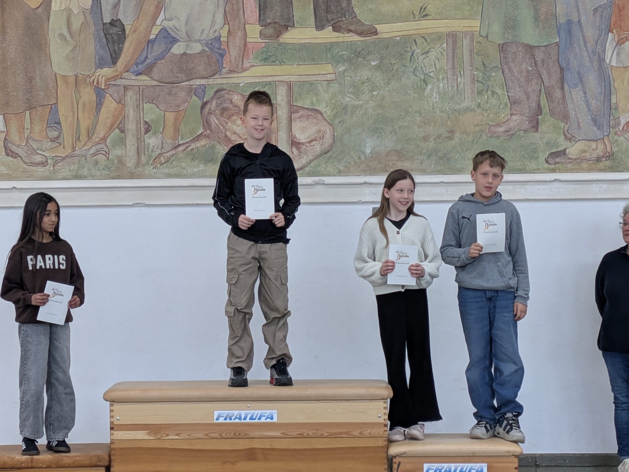 Am Freitag gab es dann eine große Siegerehrung. Jedes Kind erhielt eine Urkunde, die es stolz mit nach Hause nehmen durfte. Außerdem strahlten die jeweiligen Klassensieger auf dem Siegertreppchen und bekamen einen verdienten Applaus.