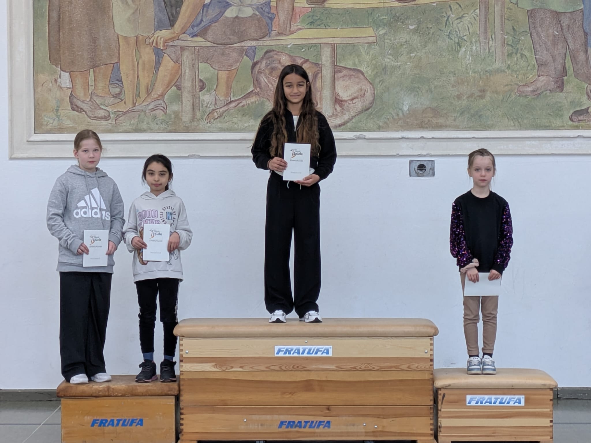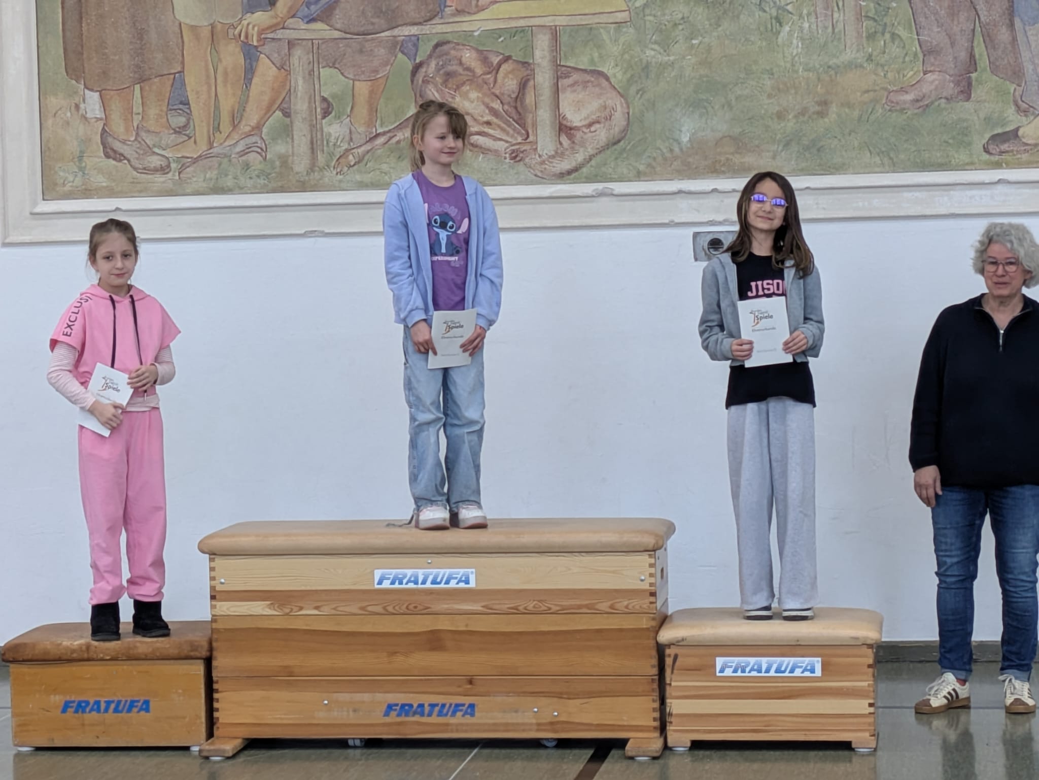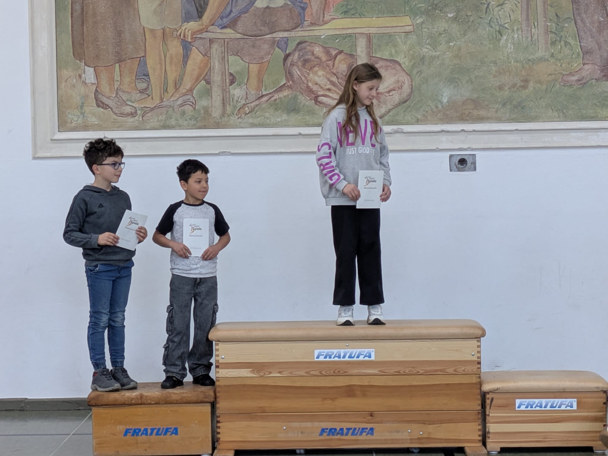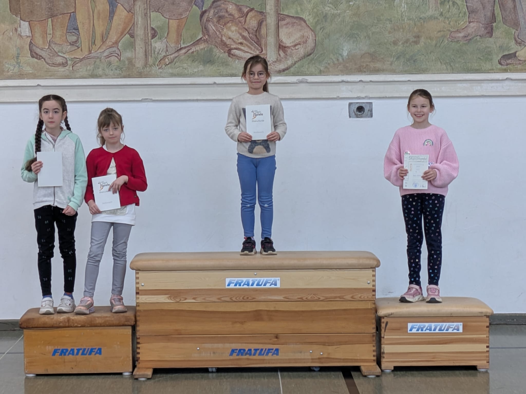 Am Freitag gab es dann eine große Siegerehrung. Jedes Kind erhielt eine Urkunde, die es stolz mit nach Hause nehmen durfte. Außerdem strahlten die jeweiligen Klassensieger auf dem Siegertreppchen und bekamen einen verdienten Applaus.